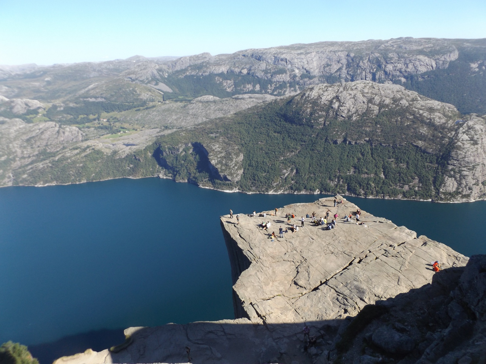 A meredek kaptatót követően hamarosan felértünk a plató szintjére, ám a kilátóig még párszáz métert kellett megtennünk. Be kell vallanom, nem tériszonyosoknak való hely ez. Néhol csupán 4-5 méter széles sziklapárkányon vezet az út, mindenféle biztosítókorlát nélkül. A kilátó egy nagyjából 25 x 25 méteres sziklaterasz, amelynek három oldala 604 méter mély szakadék. A bátrabbak kiállnak a szélére, vagy inkább kihasalnak (így lehet elejét venni az esetleges hirtelen széllökések okozta életveszélyes szituációknak is), hogy életük fotóját készítsék, készíttessék el. A még vakmerőbbek pedig szélére ülve lábukat a mélységbe lógatva szelfizgetnek. Magam megelégedtem azzal, hogy a kilátó fölötti szirtre mászva, számomra biztonságosabbnak tűnő helyről, felülről örökítsem meg ezt a gyönyörű alakzatot. A felvétel készítésekor már jócskán megfogyatkoztak a turisták. Jól láthatóan alig lézengenek rajta néhányan. Pedig néhány órával ezelőtt több százan is lehettek itt. A kilátás a Lysefjord (Fény-fjord) sötétkék vizére, a szemközti fehér sziklafalak nyújtotta háttérrel hosszú percekre rabul ejtett. Kész szerencse, hogy a látványt nem rondítják el mindenféle mesterséges elemek, korlátok. Így válik ténylegesen korlátok nélkülivé a panoráma.