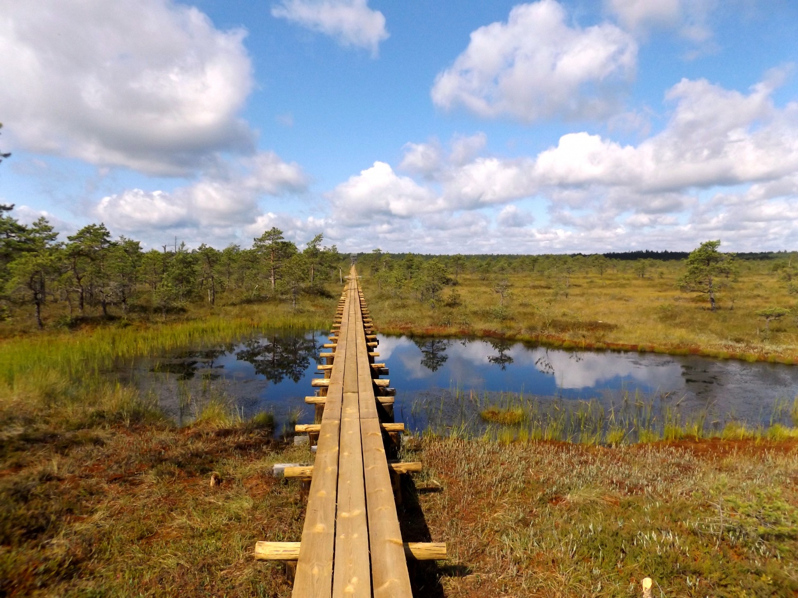 Jelen cikkem témájául szolgáló felvétel a pallórendszer beszállásánál készült. Itt a már felújított ösvényen járhattunk, néhány száz méter megtétele után azonban még a régi, kissé foghíjas deszkákon kellett egyensúlyozni. A kellemes nyári időben, ragyogó napsütésben az aprócska tavacskák tükrözték vissza az ég kékjét, végtelen nyugalmat árasztva (egyikükben lehetőségünk volt megnártózni). Azért a történethez az is hozzátartozik, hogy közel 40 fős társaság tagjaként vettem részt ezen a túrán, de a pallóhoz érve sikerült a csoport elején haladnom, így az üres, végtelenbe vesző ösvényt is meg tudtam örökíteni. A csapat közepén vagy végén haladva erre aligha lett volna lehetőségem.