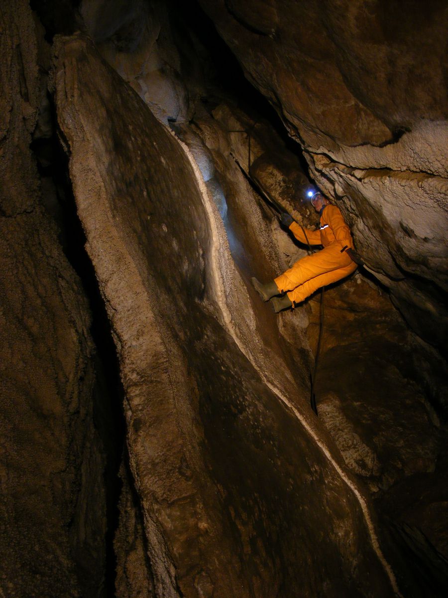 Itt már jó ideje természetes üregben, vagyis barlangban tartózkodunk, ám az igaz csoda a képen is látható kitett szakasz leküzdése után vár ránk. Bár messziről nehéznek tűnik a feljutás, a hasadék – amennyiben az ember biztos a dolgában – kötél nélkül is könnyen mászható (a felvételen látható kötelet régen rögzítették, nem tűnt biztonságosnak, így társunk, Benkovics-Molnár Györgyi csak a fotó kedvéért kapaszkodott bele).