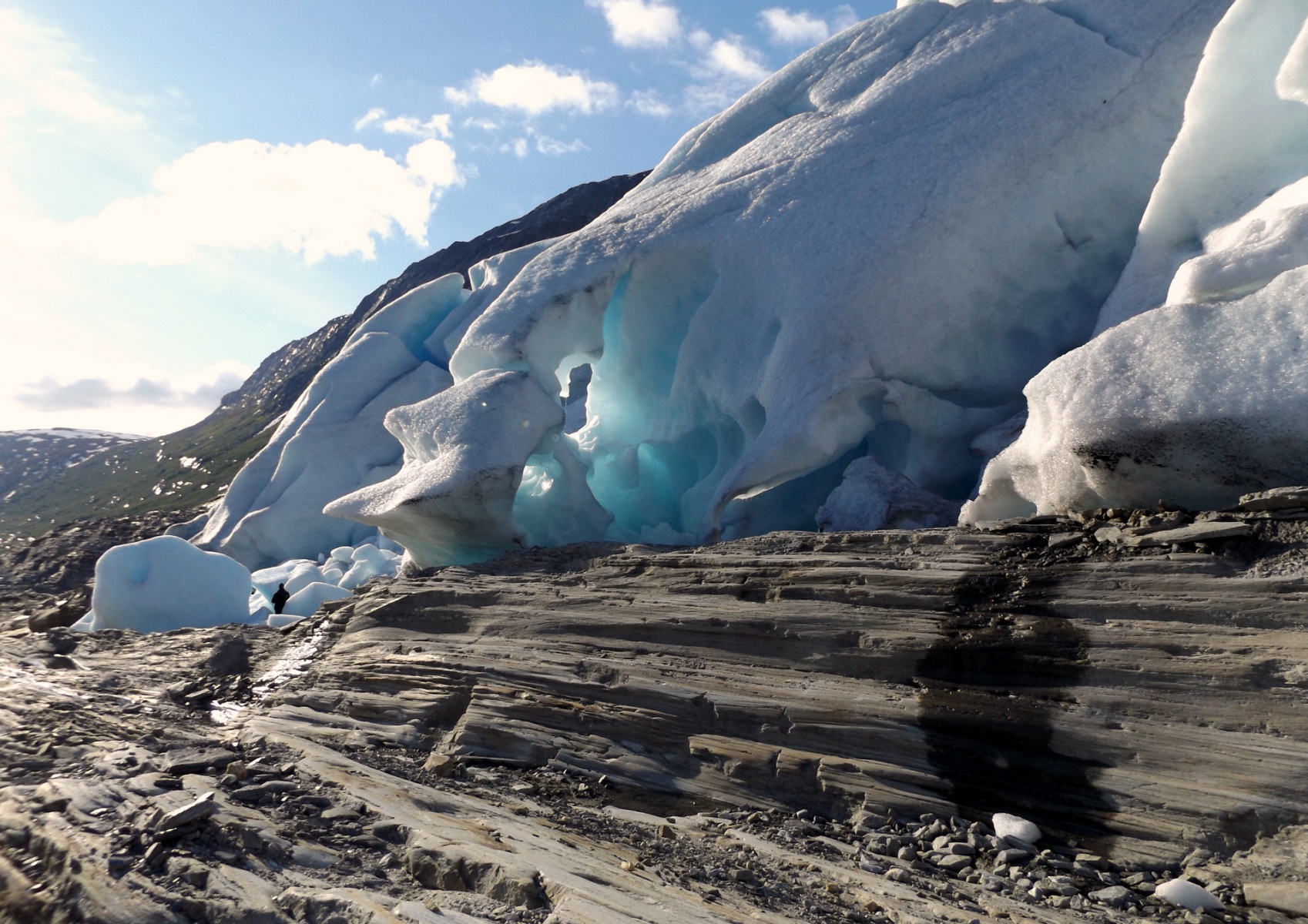 A különös növényeknek, így a húsevő harmatfűféléknek is menedéket szolgáltató vöröses, jégkaristolta gránitsziklákon a csapás nem egyértelmű, s bár idővel a gleccser látványa is feltűnik, megközelítése a sziklákat átszelő mély hasadékok késztette kerülők miatt, amelyek csalóka módon nem látszódnak a felvételen, kissé körülményes. A számunkra még mindig hatalmas (felvételemen a gleccser bal szélénél kivehető egyik társunk alakja), bár méreteiben évről-évre csökkenő jégár közelében tartózkodni feledhetetlen és kissé szomorú élmény. Különösen így van ez, ha a belegondolunk mulandóságába.