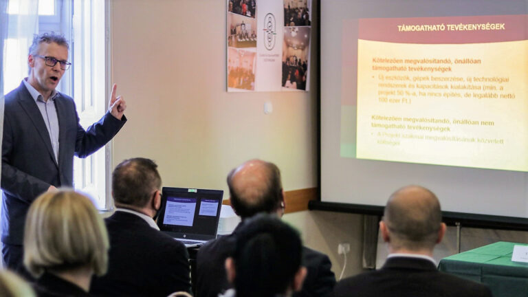 Ezután a jelenlévők Petrovics Jánosra, a Széchenyi Programiroda Nonprofit Kft. pályázati tanácsadójára figyeltek, aki nemes egyszerűséggel azt mondta: ez az elmúlt tíz év egyik legjobb európai uniós pályázata, ugyanis egyszerű és a többihez képest magas a támogatási intenzitás. Előadása elején rögtön hangsúlyozta: olyan mikrovállalkozások pályázhatnak, amelyek rendelkeznek legalább egy teljes, azaz lezárt üzleti évvel, nem végeznek mezőgazdasági tevékenységet, illetve nem KATA szerint adóznak. Elmondta, hogy a tervek szerint 2023. márciusáig lesz nyitva a pályázat, ugyanakkor nagy érdeklődésre számít, így azt tanácsolta a vállalkozóknak, hogy ne várjanak sokáig és minél hamarabb töltsék fel a dokumentumokat. Ismertette, hogy a projektben kötelezően megvalósítandó tevékenységnek kell szerepelnie, például az eszközbeszerzésnek, technológiai rendszerek, kapacitások kialakításának, vagy ingatlanfejlesztésnek el kell érnie a teljes költség ötven százalékát. Emellett a projekt szakmai megvalósításának közvetett költségének – vagyis a dokumentáció összeállítására, projektmenedzsmenti tevékenységre vonatkozó összeg – a projekt összköltségének 7 százalékának kell lennie.
