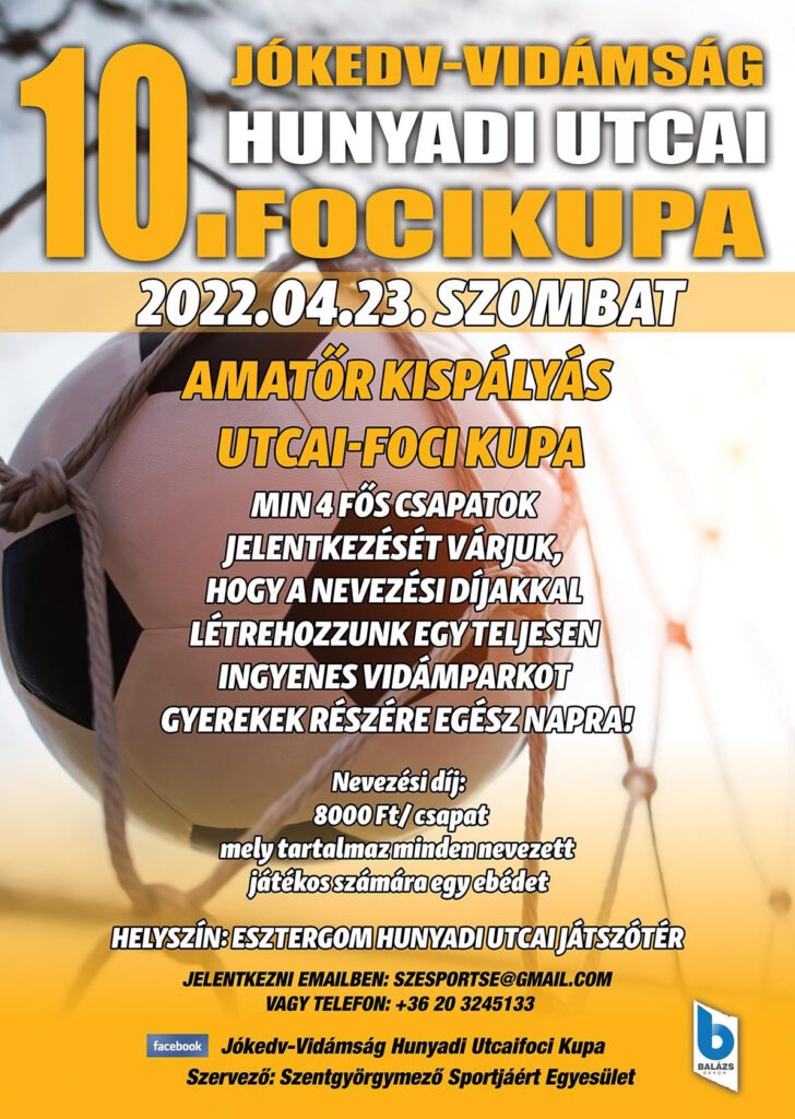 Április 23-án, szombaton Esztergomban a Hunyadi utcai játszótéren amatőr kispályás utcai focikupát szervez a Szentgyörgymező Sportjáért Egyesület. A nevezési díj 8000 Ft/csapat, mely összeg tartalmaz minden játékos számára egy ebédet, valamint az így befolyt pénzből a szervezők egy teljesen ingyenes, egész napos vidámparkot szeretnének létrehozni a gyerekek részére.