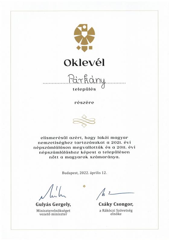 Az oklevél szövege: Oklevél Párkány település részére elismerésül azért, hogy lakói magyar nemzetiséghez tartozásukat a 2021. évi népszámláláson megvallották és a 2011. évi népszámláláláshoz képest a településen nőtt a magyarok számaránya.
