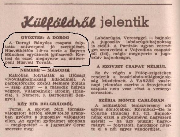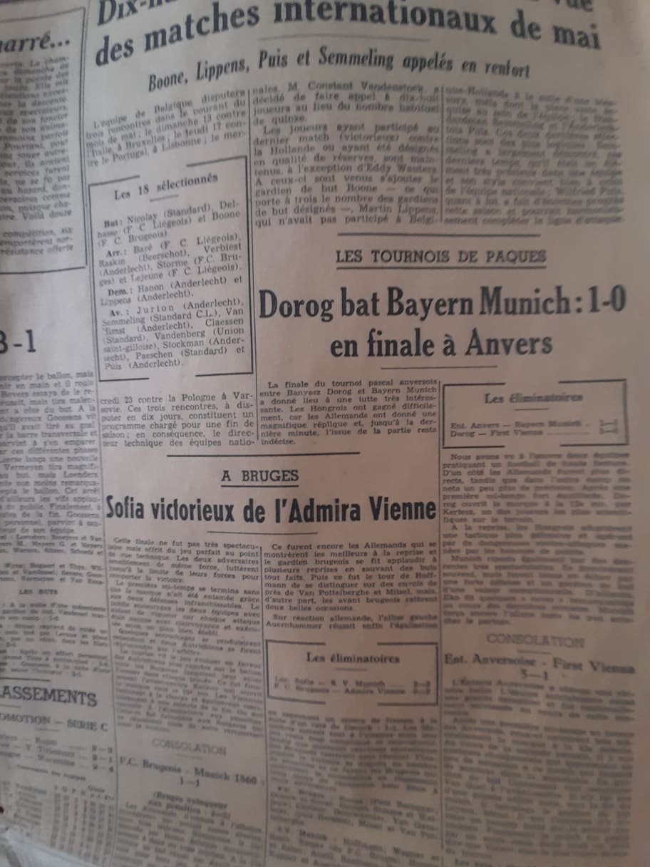 Ezzel a dorogi csapat a februári NDK-beli tornáját követően folytatta a kitűnő szereplését a nemzetközi porondon, azonban az év további jeles eseményeket is tartogatott, amelyekről szintén igyekszem a megfelelő időben megemlékezni. A mieink által nyert belga kupa igazán méretes és díszes trófea volt, amelyet sokáig a klub székházának irodahelyiségeiben őriztek és ott is lehetett megcsodálni. Sajnálatos módon, idővel eltűnt és hollétét jótékony homály fedi. Mire a Dorogi Sportmúzeum megnyitásához történt előkészületek során az ereklyék összegyűjtésre kerültek volna, addigra már rég nem volt fellelhető. Kézzel fogható tárgyi emlék azonban így is fennmaradt, mégpedig az egyik neves belga újságban a tornáról megjelent tekintélyes terjedelmű cikk Buzánszky Jenő jóvoltából megőrződött, amelyet a dorogi múzeum tárlatának adományozott.