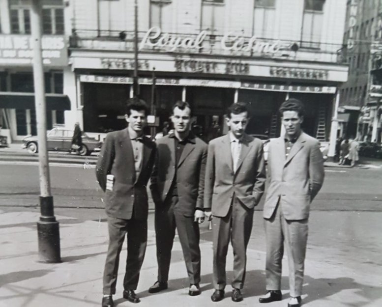 A csapat tagjai városnézésen Brüsszelben. A felvételen – balról jobbra – Marosvölgyi András, Monostori Tivadar, Surányi József és Lakat Jenő a Royal Casino épülete előtt látható (forrás: A Monostori család albumából)