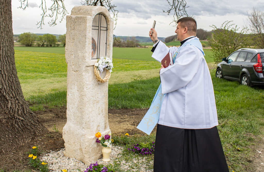 A beszédek után Rajk János plébános atya megáldotta a felújított Szűz Mária emlékoszlopot, majd elvégezte a búzaszentelési szertartást.