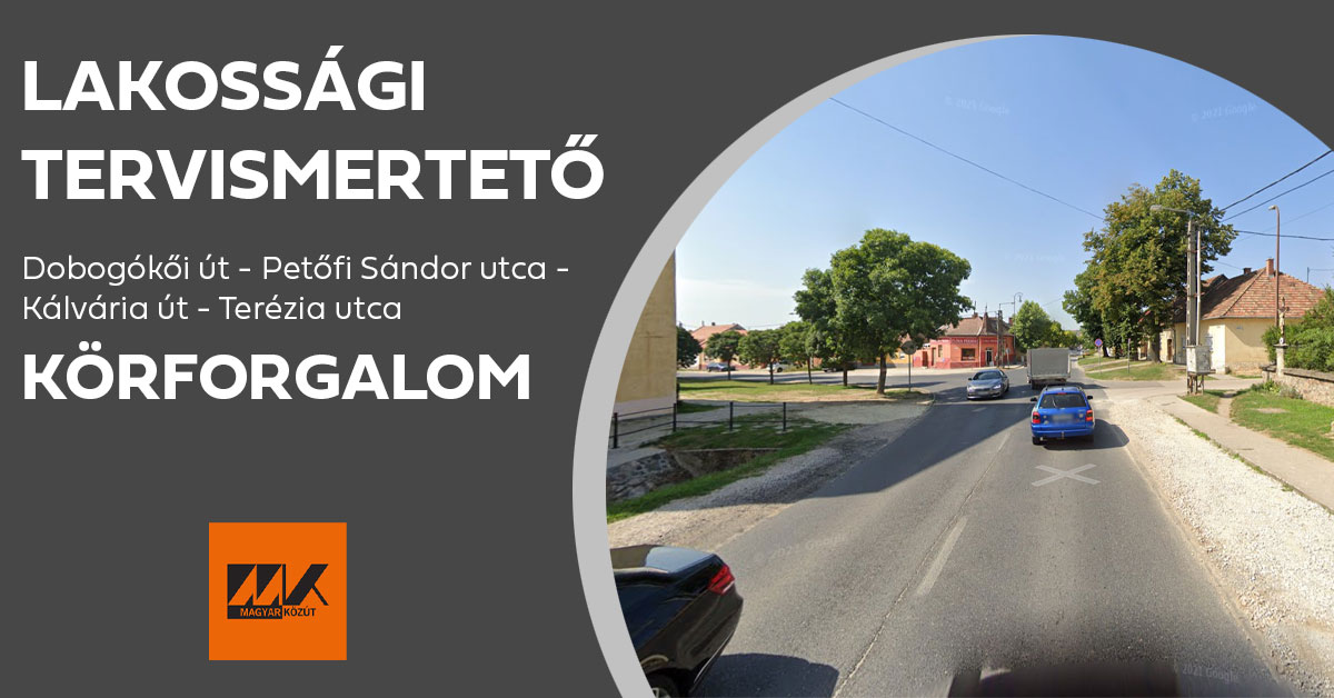 A Magyar Közút Nonprofit Zrt. lakossági tervismertetőt tart az esztergomi Dobogókői út – Petőfi Sándor utca – Kálvária út – Terézia utca körforgalmi csomópontjával kapcsolatban.