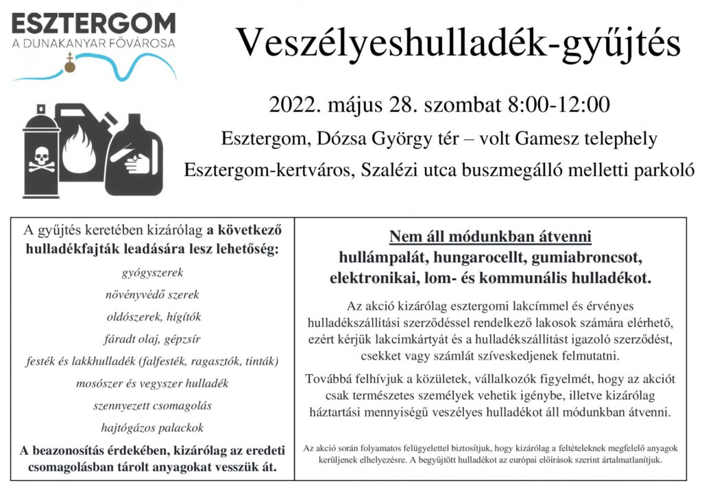 Május 28-án veszélyeshulladék-gyűjtési akciót szerveznek Esztergomban.