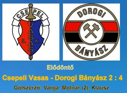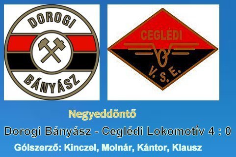 Az utolsó előtti állomás igen kemény csatának ígérkezett. A szigetországi csapat a Dózsához hasonlóan a dorogiak előtt végzett a bajnoki tabellán, viszont akárcsak az újpestieket, a vasgyáriakat is legyőzték a bányászok, ráadásul idegenben, mégpedig 3–1-re. A kupában újfent Csepelen csaptak össze és a kirobbanó formában lévő dorogiak a bitang erős hazaiak ellen azt a luxust is megengedhették maguknak, hogy kétgólos előnyt adjanak ellenfelüknek. A piros-feketék mintha az öltözőbe ragadtak volna, hiszen a csepeliek rögtön az első percekben kétszer is gólt értek el. Aztán felpörgött a Dorog és ledolgozta hátrányát. A rendes játékidő 2 : 2-es döntetlennel zárult, majd jött a kétszer negyedórás hosszabítás. Mindkét játékrészben újabb dorogi gól esett, amellyel biztosan lőtték magukat a fináléba. Két másik nagyágyú, a Fradi és a Honvéd néhány körrel korábban már búcsúzott. A Bp. Kinizsi néven szereplő címvédő ferencvárosiakat éppen a Honvéd, őket pedig a pécsiek ejtették ki.