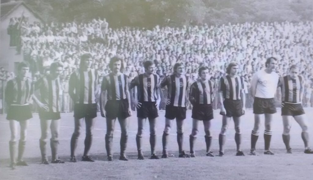 Teltházas meccs Dorogon, a Fradi ellen felsorakozott dorogi legénység 1976 augusztus 27-én