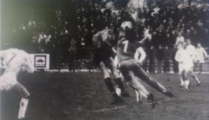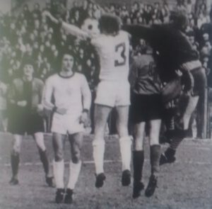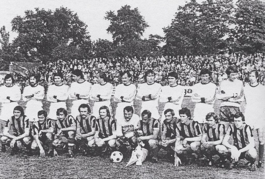 A máig legutolsó NB I-es banoki mérkőzés Dorogon. A csíkos mezes dorogiak együtt az Újpesti Dózsa legénységével 1977. június 4-én.