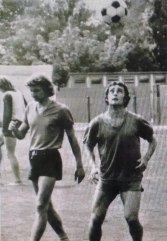 Készülődés a szezonra 1976 nyarán. Bartalos bűvöli a labdát, mellette Major, a háttérben Péntek