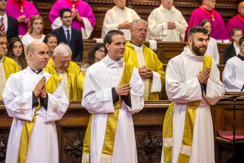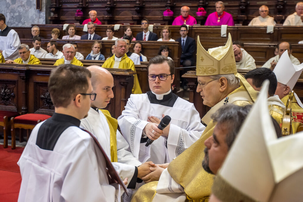 Áldozópappá szentelte szombaton Erdő Péter bíboros, prímás Bársony Árpád, Farkas Ferenc Ákos és Szűcs Bálint Géza diakónusokat, illetve diakónussá Faragó András és Héray Márton (FSO) akolitusokat.