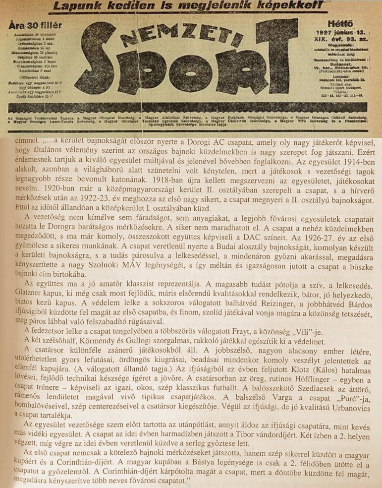 Amikor 1914-ben hivatalosan is megalakult a dorogi klub, már akkor érezhető volt, hogy nem holmi „falusi” egyesület lesz. Igen rövidőn belül üstökösként robbant be az ország sportjának központi vérkeringésébe és már a húszas évek első éveiben is egyre jobban csengett a Dorog név, az 1927-es események viszont olyan szintre repítették az egyesületet, amely kitörölhetetlenné tette nevét és elismertségét. Ennyi siker nem lehetett a véletlen műve, mint ahogy nem is volt az. Ezt pedig a sorra jövő közvetlen évek is híven bizonyították. Azt sem szabad elfeledni, hogy a csapat játékosai nem főállású sportolók voltak. Valamennyien munka mellett érték el ezt a szintet, s elképesztő, hogy fizikailag is kifogástalanul bírták. A mérkőzés-sorozatok, a tréningek mellett nem kis energia kellett a sok és hosszú utazásokhoz. A csapat és az egyesület már abban az időben is komoly témája volt a sajtónak, kiemelten az ország két legtekintélyesebb sportorgánumának, a Nemzeti Sportnak és a Sporthírlapnak, ahol rendszeresen cikkeztek a dorogiakról. 1927 nyarán a Nemzeti Sport oldalán komoly terjedelemben jelent meg pártatlan szakvélemény és elemzés a Dorogi AC egyesületéről és csapatáról, amelynek egy részét az alább közzétett másolat betoldásban lehet olvasni.