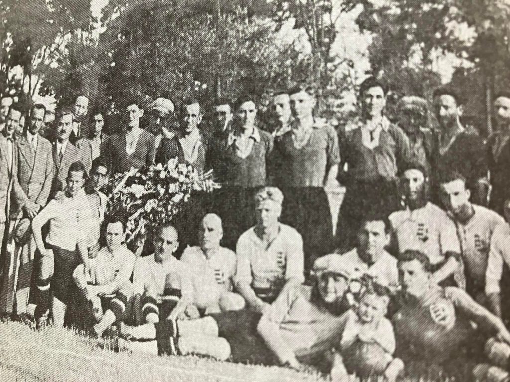 A fehér mezes magyar amatör válogatott tagjai között középen látható két dorogi, Bárdos Sándor és Frayt Miklós, a Bulgária elleni mérkőzésen