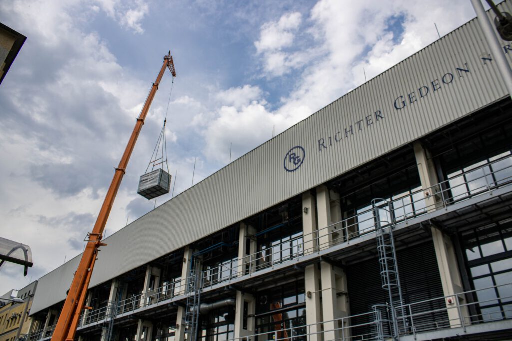 A napokban betekintést nyerhettünk a Richter dorogi gyárának területén jelenleg zajló beruházásokba. Garai Zoltán, a gyáregység főmérnöke elmondta, hogy modernizálják a Szteroid üzemet. Ezáltal nemcsak esztétikusabb, hanem korszerűbb is lesz az épület. Kicserélik többek között a nyílászárókat, új légtechnikai rendszert telepítenek az üzem gyártócsarnokába. Épp ennek egyes elemeit emelte a daru a tetőre, mialatt a helyszínen a dorogi gyáregység vezetőjével beszélgettünk.