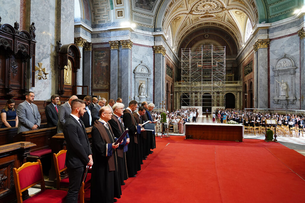 Az ünnepség hálaadással kezdődött a Nagyboldogasszony- és Szent Adalbert Főszékesegyházban, ahol a szülők és hozzátartozók is részt vettek. Az ünneplők megtöltötték a felújítás alatt álló Bazilikát, ahol beszédet mondott Kuminetz Géza, a Pázmány Péter Katolikus Egyetem rektora, Birher Nándor, a Bölcsészet- és Társadalomtudományi Kar dékánja, Hernádi Ádám, Esztergom polgármestere, valamint Velez Vilmos, a Hallgatói Önkormányzat elnöke.