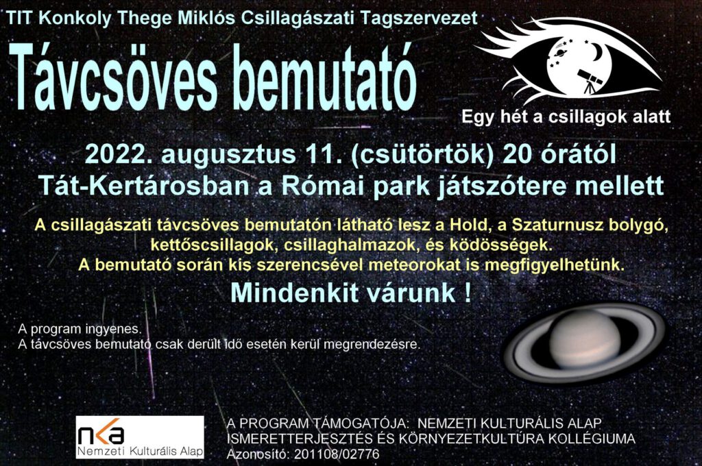 A TIT Konkoly Thege Miklós Csillagászati Tagszervezet szervezésében távcsöves bemutatót tartanak augusztus 11-én, csütörtökön 20 órától Tát-Kertvárosban, a Római park játszótere mellett.