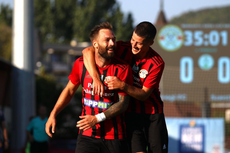 Ilyen örömöt szívesen gyakrabban is látnánk: Szerencsi Miklós köszönti a vezető gólunk szerzőjét, Paudits Patrikot, a szerdai mérkőzésen (forrás: Dorogi FC.hu)