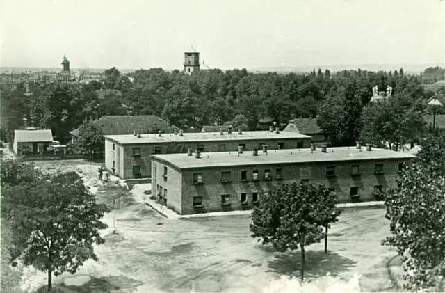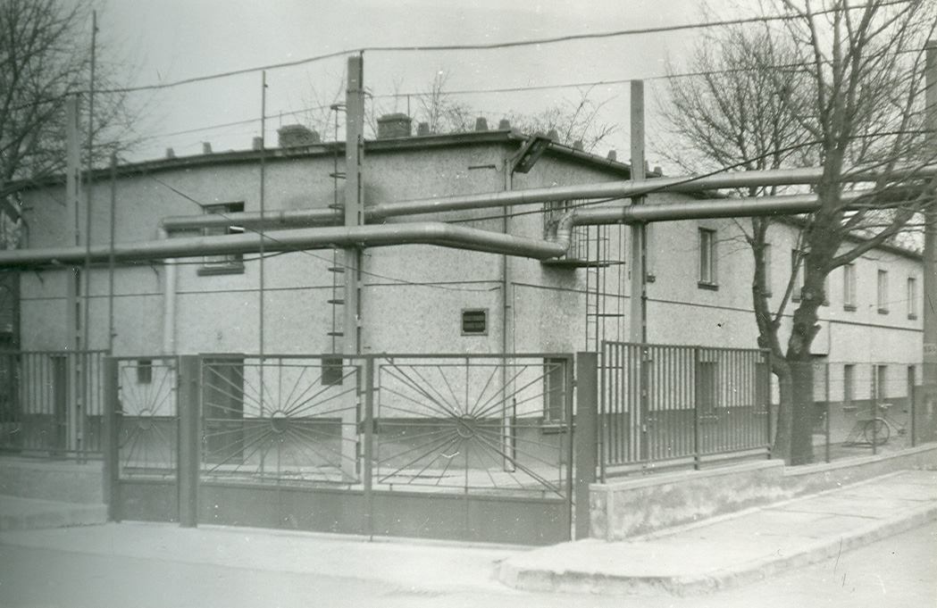 A leendő ruhagyár látképe az Otthon téren a Művelődési központ irányából az ötvenes években, amikor még a munkásszálló működött.