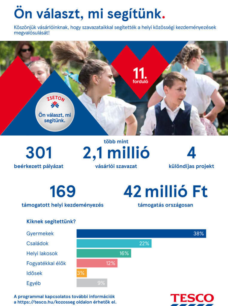 Az „Ön választ, mi segítünk” 11. fordulójában országosan több mint 2,1 millió zsetonnal szavaztak a Tesco vásárlói, a vállalat pedig összesen 42 millió forinttal járul hozzá 169 nyertes projekt megvalósításához.