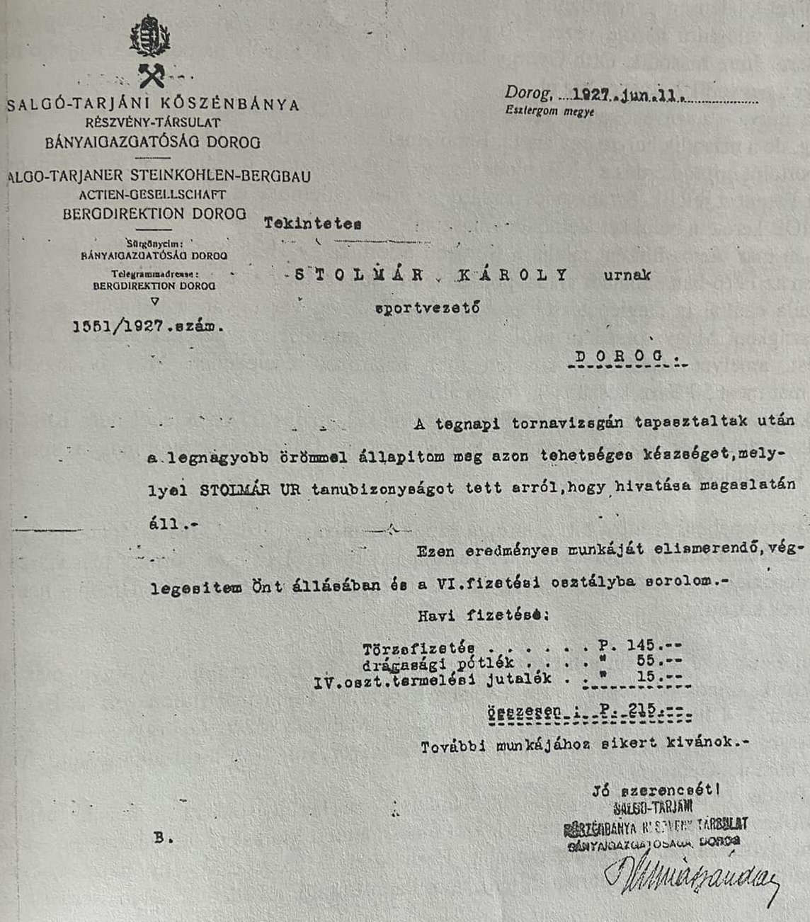 Solymár Károly kinevezése 1927-ben Schmidt Sándor aláírásával (forrás: Dorogi Sportmúzeum)