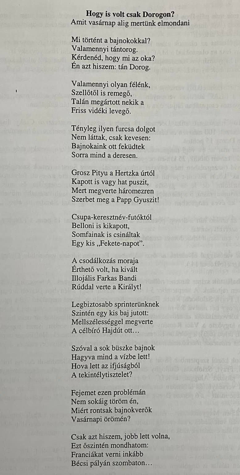Fekete elemében volt, aki megtoldotta ragyogó teljesítményét a távolugrásban aratott győzelmével is, amelyet szintén rekorddal, 680 cm-es ugrással ért el. A legnagyobbak gyászos napját hozó versenyen viszont további dorogi sikerek is születtek. Soltész 200, míg Kömley 800 méteren lett dobogós, mégpedig mindketten harmadik helyezettként. A közönség igazán jól szórakozott és bizony nem mindennapi élményben lehetett része. Az elit sportolók csalódottan, egyesek sértődötten távoztak a dorogi arénából, s már a másnapi Nemzeti Sport főcímben számolt be az eseményről: „Példátlan bajnokverés volt tegnap Dorogon” címmel. S, amennyiben nem lett volna éppen elég kínos a vesztes sportolóknak a bukás, egy igazán frappáns versikébe faragott sorok is napvilágot láttak, amelyet változtatás nélkül itt teszek közzé.
