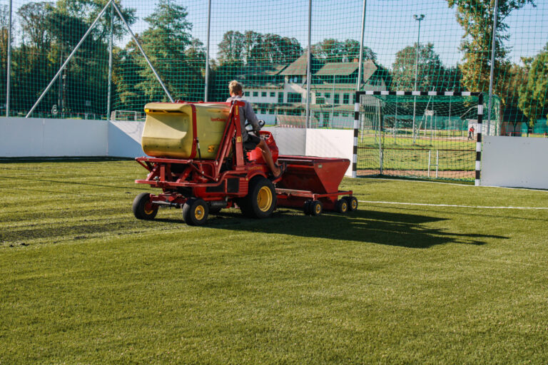 Kedden kitöltőanyagként granulátumot szórtak a pályára, melyet úgymond „befésültek” a műfű közé. A pálya körül jelenleg oszlopokat telepítenek, ami acélkerítést kap majd, ezt követően pedig az acélkerítés és a futballpálya hálója közötti részen térkőburkolatot helyeznek el.