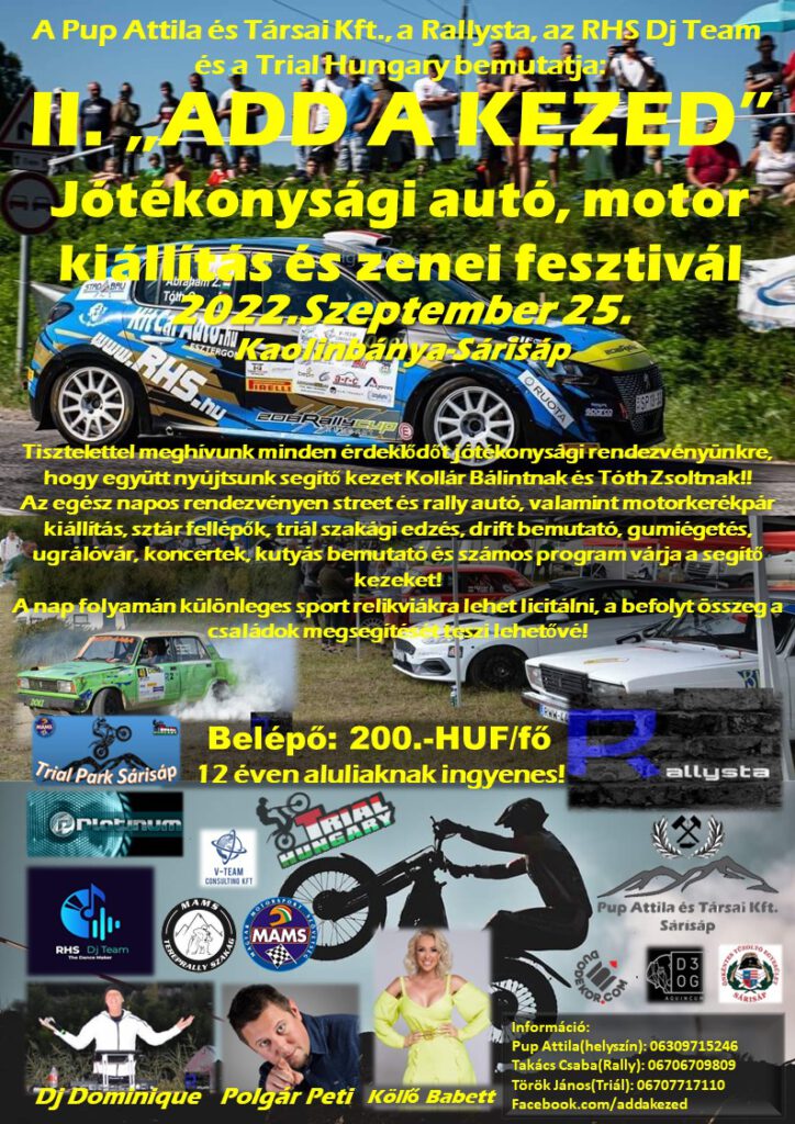 Folyamatosan bővül a fellépők sora a II. ADD A KEZED Jótékonysági Motor-Autó Kiállítás, és Zenei Fesztiválra, melyet szeptember 25-én, vasárnap rendeznek meg a sárisápi kaolinbánya területén elhelyezkedő triál pályán. A szervezők ezúttal két beteg személynek, valamint családjuk számára szervezik a gyűjtést.