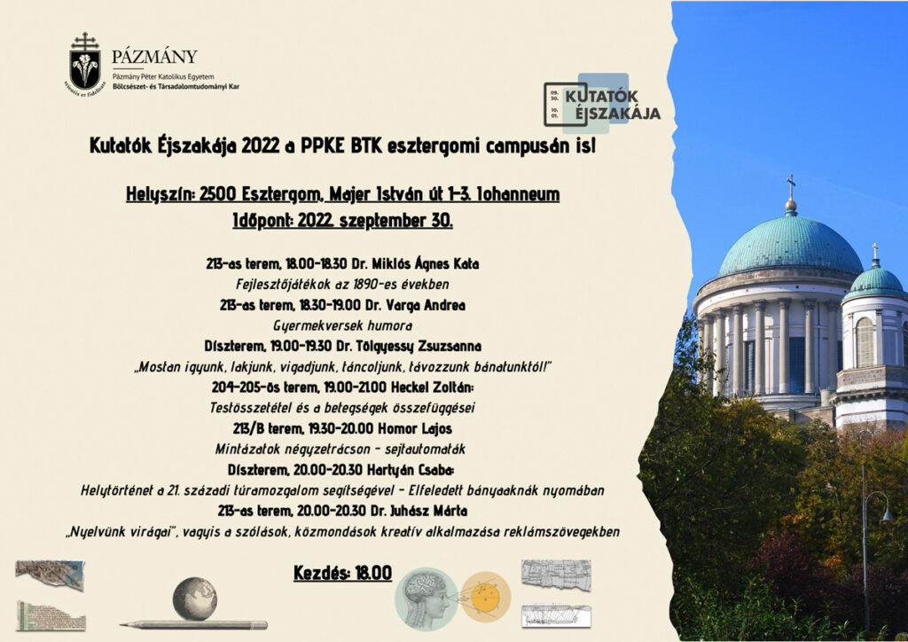 Szeptember 30-án, pénteken 18 órától rendezik meg a Kutatók Éjszakáját a PPKE BTK esztergomi képzési helyszínén.
