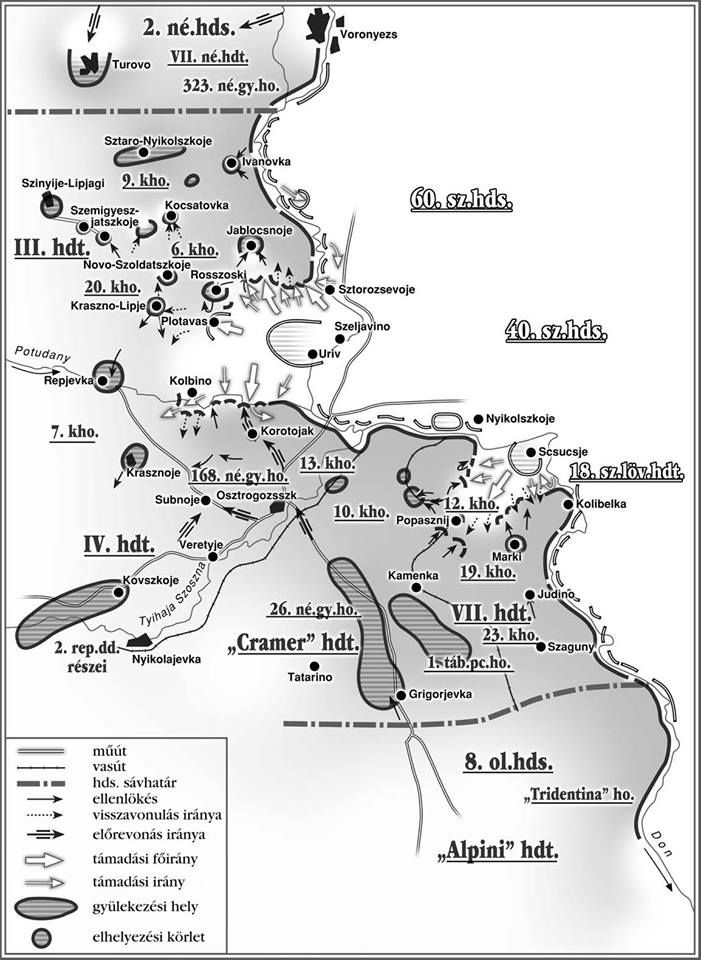 A támadó erők folyamatosan nyomultak előre, bár az erős és eltökélt szovjet ellenállás nagy áldozatokat követelt a soraikban. Ezzel együtt sem tudták feltartóztatni a Vörös Hadsereg alakulatai a németeket és szövetségeseit a Don és a Volga folyókig történő térnyerésében. A magyar hadsereg a Don menti hídfőállások megszerzéséért ádáz küzdelmet folytatott, amelynek során a legtöbb kijelölt fontos stratégiai pontot sikerült elfoglalnia. Egyedül Uriv környékén maradt néhány harcállás orosz kézen. Nyár végéig mintegy 25 ezer főt vesztett a magyar fél, ezért további 30 ezer főt vezényeltek a pótlásukra. A magyar katonák azt az ígéretet kapták, hogy a fronton harcolók hadieszközöket, ruházatot és élelmet kapnak részben a német féltől, továbbá csak rövidebb időszakot kell szolgálniuk, majd érkezik a folyamtos váltás. A frontkatonák legrosszabb esetben is úgy számoltak, hogy Karácsonyra otthon lehetnek. A Sztálingrádért folytatott harcok azonban nagyon elhúzódtak és rettentő veszteséggel jártak. A magyar hadseregnek a többi szövetséges haderővel pedig változatlanul ki kellett tartania eredeti helyén, biztosítva a sztálingrádi ostromot. A tél további nehézségeket rótt a felekre és az ígéretek teljesítése rendre elmaradt. Valamennyi résztvevő alakulat közül a magyarok rendelkeztek a legelmaradottabb hadifelszereléssel. A magyar katonák becsapottnak és magukra maradottnak érezték magukat. Ennek ellenére kitartottak és ilyen körülmények közepette érte őket a nagyszabású orosz ellentámadás 1943. január 12-én, amelyet a 40. szovjet hadsereg hajtott végre. A szovjet erők a hátországban elképesztő méretű és a lehető legjobban felszerelt hadosztályokat szerveztek, amelyet a Volga és Don környékére összpontosítottak. Elsőként a román vonalakat törték át, de a többi véderő sem tudott sokáig ellenállni a mindent elsöprő orosz offenzvának. A magyarok soraiban január 14-én okoztak nagy csapást az oroszok és 17.-re teljes lett a káosz. Innen kezdve folyamatos menekülés és visszavonulás zajlott. A Don menti véderők mintegy 200 km hossza teljesen összeomlott és fokozatosan szorultak nyugatra. Hosszú és szörnyű agóniát követően április második felétől kezdték hazaszállítani a szétvert magyar hadsereg maradványát.