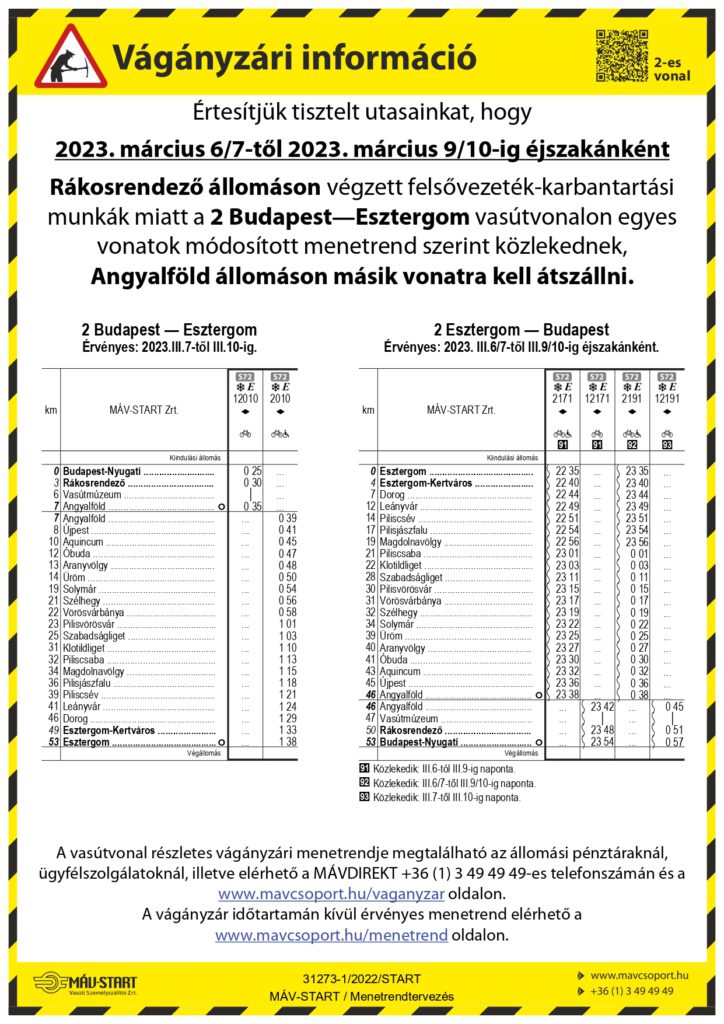 A MÁV Zrt. értesíti az utasokat, hogy 2023. március 6/7-től 2023. március 9/10-ig éjszakánként Rákosrendező állomáson végzett felsővezeték-karbantartási munkák miatt a 2 sz. Budapest—Esztergom vasútvonalon a hirdetményben szereplő vonatok módosított menetrend szerint közlekednek, Angyalföld állomáson másik vonatra kell átszállni.
