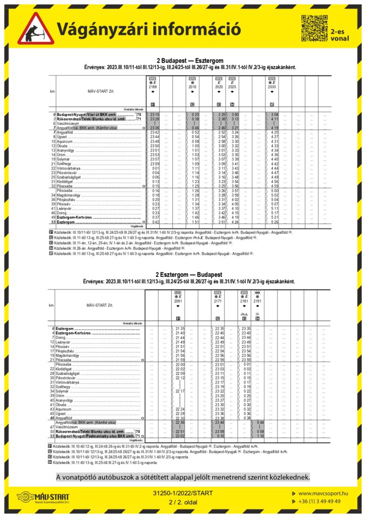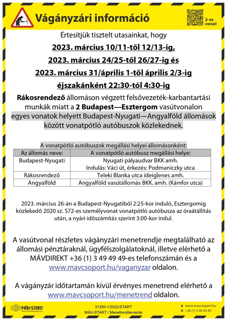 A MÁV-START Zrt. tájékoztatása szerint 2023. március 10/11-től 12/13-ig, március 24/25-től 26/27-ig és március 31/április 1-től április 2/3-ig éjszakánként 22:30-tól 4:30-ig Rákosrendező állomáson végzett felsővezeték-karbantartási munkák miatt a 2 sz. Budapest—Esztergom vasútvonalon a hirdetményben szereplő vonatok helyett a Budapest-Nyugati és Angyalföld állomások között vonatpótló autóbuszok szállítják az utasokat.