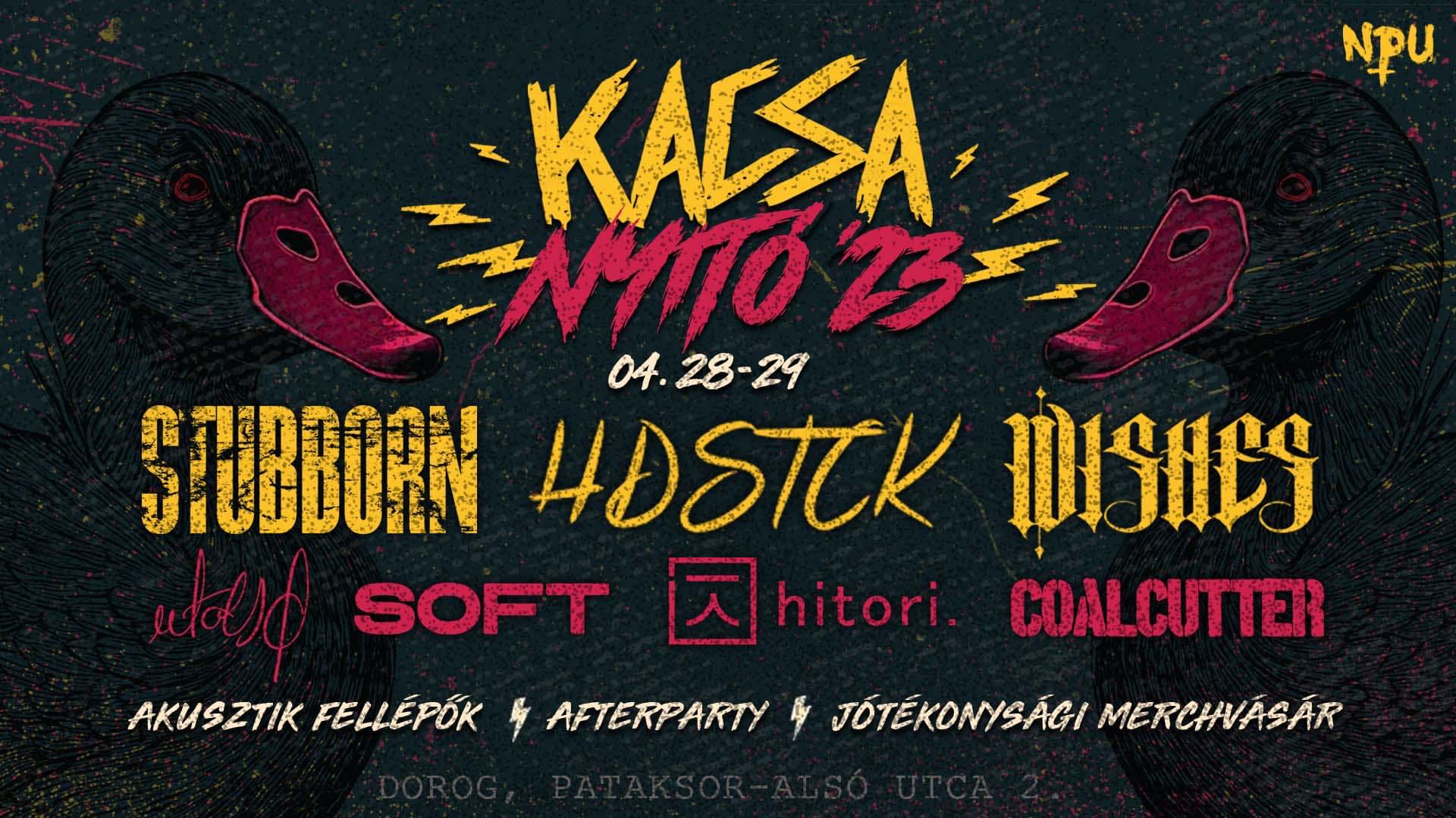 Április 28-29-én jótékonysági merch-vásárral és fergeteges Stubborn, Headstock, Wishes koncertekkel nyit a térség legnépszerűbb szabadtéri vendéglátóhelye a Kacsa Kocsma. A felajánlani kívánt zenekarokkal kapcsolatos relikviákat már most leadhatjátok Dorogon, Esztergomban és Táton. A jótékonysági akció bevételét az esztergomi Szent Rita Otthonnak ajánlják fel!