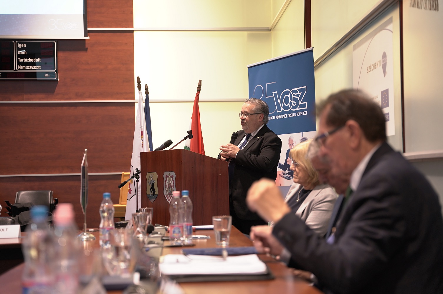 „A VOSZ idén ünnepli a 35 éves fennállását, a jubileum időszakában pedig kifejezetten nehéz időszakot élnek meg a vállalkozók. Ennek ellenére az érdekképviselet továbbra is alapértékeihez hűen dolgozik a vállalkozásokért, működésük sikerességéért.” – mondta el az eseményen Eppel János, a VOSZ elnöke. Hozzátette: a VOSZ átalakulást él meg, egy növekedési pályára állt a tavaly elfogadott ötéves stratégiájának köszönhetően és a vállalkozói felmérések eredményeinek elemzése alapján. A szövetség a meglévő értékeit, a szakértelmet, a tudást és a vállalkozói szektorban összegyűlt ismeretét igyekszik még inkább a munkaadók javára kamatoztatni és a korábbiakhoz képest is még láthatóbbá tenni. „Az elmúlt 35 évben a VOSZ volt a legvonzóbb, legaktívabb és szakmailag is leghitelesebb önálló érdekképviselet. Szeretnénk ezt a munkát folytatva továbbra is egyfajta támogató partner lenni a vállalkozások számára.” – fogalmazott az elnök, aki szerint különösen az aktivitáson kell erősíteni a közeljövőben. Az elnök beszédében kifejtette: a VOSZ szakmai tanácsadással, a kedvező kamatozású Széchenyi Kártya Program hiteleinek forgalmazásával, érdekképviseleti tevékenységgel, képzéssel és más magas szintű és egyre fejlődő szolgáltatásokkal segíti a magyar vállalkozókat. Az idei évben tovább folytatódik a tavaly elindított, komplex vállalkozásfejlesztési program megvalósítása.