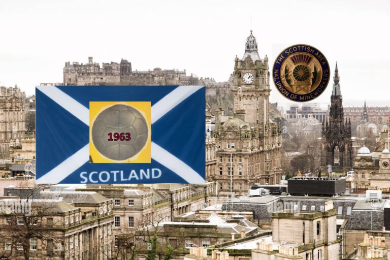 Borítókép: Edinburgh látképének montázsa a skót zászlóval és a Skóciai Országos Bányaipari dolgozók Szövetségének emblémájával.
