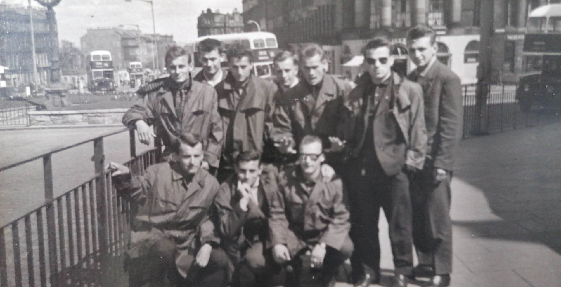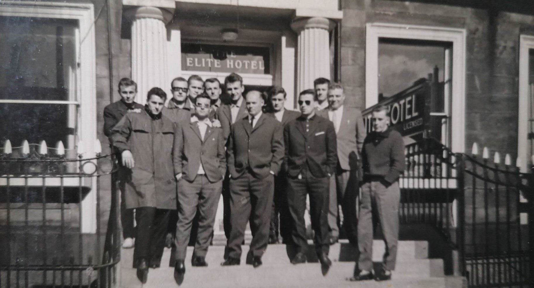 Buzánszky Jenő játékosainak körében az edinburgh-i szállásuk bejáratánál (forrás: Turai József albumából)