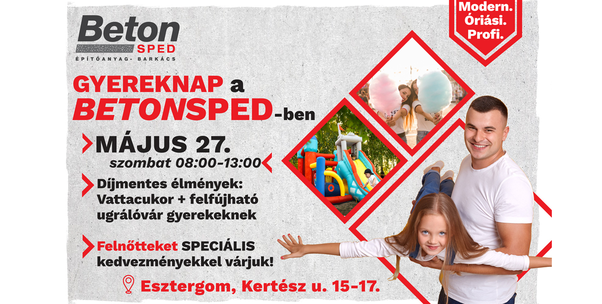 A BetonSped speciális kedvezményekkel várja az érdeklődőket az esztergomi építőanyag kereskedésükben és barkácsáruházukban a Kertész utca 15-17. szám alatt. Amíg a felnőttek nézelődnek addig gyereknap alkalmából a lurkók az ugrálóvárban játszhatnak és vattacukrot fogyaszthatnak!