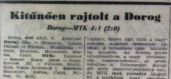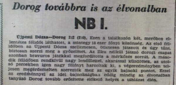 Az utóbbi bejött, mert gól nélküli döntetlenre végeztek a felek, akárcsak a Dorog az MTK otthonában. Ez viszont azt jelentette, hogy a fővárosi kék-fehér alakulat megtartva egy pontos előnyét a dorogiakkal szemben, a Fradi mögött a 2. helyen zárt. Az Újpesttel pedig pontazonossággal állt a Dorog, viszont a Dózsa jobb gólarányával a 3. lett. Ezáltal a legnagyobb siker mégis bőven hagyott hiányérzetet a dorogiakban és teljes joggal. Reális esély volt akár a bajnoki címre is, de a legrosszabb estben is a bajnoki ezüst, vagy bronz kézzel fogható volt, amelyet elsősorban a Pécs elleni hazai fiaskó hiúsított meg. Ha csak döntetlenre zárult volna, már biztos harmadik a csapat, de nyertes állásból sem sikerült legalább egy pontot megfogni. A Dorog ötödik alkalommal lett az ország legjobb vidéki csapata és a teljes mezőnyben a legkevesebb gólt kapta. A dorogiakat megelőzött dobogós csapatok ellen kifejezetten pozitív mérleg mutatkozott. Csak a Fradi tudta őket még az ősszel legyőzni minimális egy góllal, míg az Újpest és az MTK ellen otthon biztos győzelmek, idegenben pedig döntetlent könyvelhettek el. A Dorog mögé szorult a Honvéd és a Vasas is, a számos kiváló vidéki egyesületről már nem is beszélve.