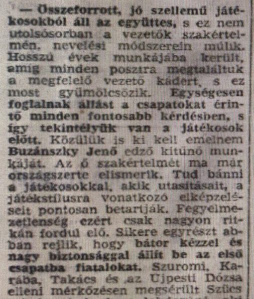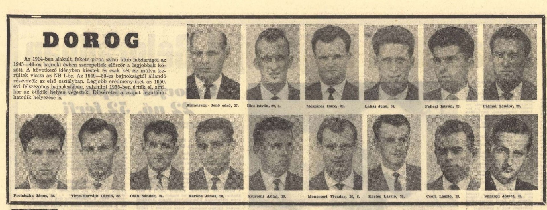 A Magyar Ifjúság hetilapban megjelent cikk. A fotókon a felső sorban balról: Buzánszky Jenő vezetőedző, Ilku István, Mészáros Imre, Lakat Jenő, Fellegi István, Pálmai Sándor. Alsó sor: Prohászka János, TIma Horváth László, Oláh Sándor, Karába János, Szuromi Antal, Monostori Tivadar, Kertes László, Csóri László és Surányi József (forrás: MIM 1962. – Regős László gyűjteményéből)