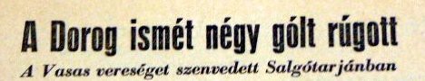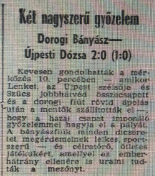 A villámrajt a következő fordulóban is folytatódott. Ezúttal is hasonlóan kiváló játékkal ismét 4–1-es győzelem született azzal a különbséggel, hogy ezúttal idegenben. Az otthonában mindig nagyon kemény diónak számító Szombathelyi Haladáson átgázoltak a bányászok és a 10 ezer főnyi buplikum szomorúságában még önkéntelenül is tapssal jutalmazta a mieink teljesítményét. A hazaiak becsületgólja is csak 11-esből esett. A Dorog máris az NB I listavezetője lett, mégpedig egyedülállóan pontveszteség nélkül, 8 : 2-es gólaránnyal vezette a tabellát.