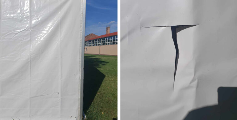 A napokban tette közzé a sárisápi önkormányzat a közösségi oldalán, hogy az új rendezvénysátruk oldalát ismeretlen tettes/tettesek felvágták.
