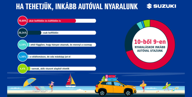 A nyári szabadságolások idején, aki teheti, útra kel, hogy országhatáron belül vagy külföldön pihenjen. A Magyar Suzuki nagy mintájú kutatásából kiderül, hogy a megkérdezettek 95,58 százaléka nyaraláskor inkább autóval utazik. Tízből heten nem változtattak korábbi szokásaikon: ragaszkodnak a saját járműhöz. Úgy gondolják ugyanis, hogy ez adja a legnagyobb szabadságot, praktikus, ugyanakkor a vezetés élvezetes elfoglaltság is, miközben biztonságos, kiszámítható megoldás.