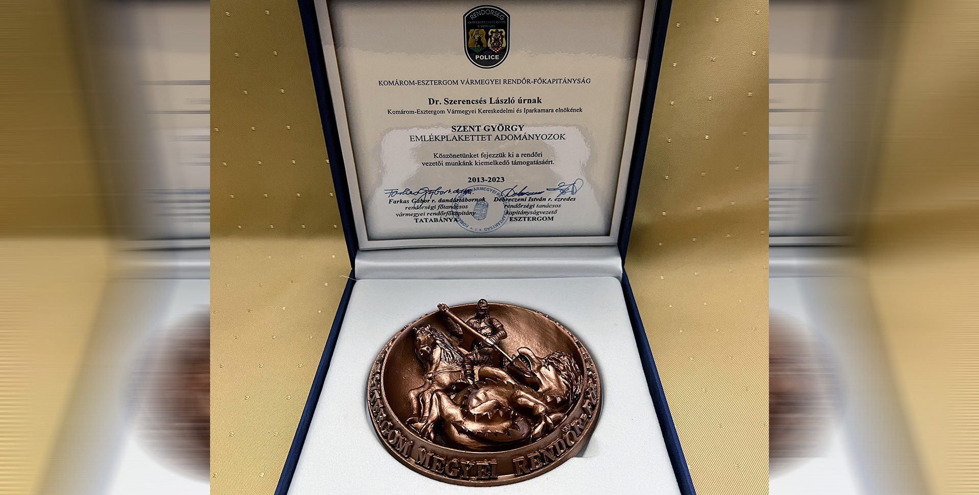 A több éves jó együttműködést, a rendőrség munkájának segítését elismerve Szent György Emlékplakettel tüntette ki vármegyénk rendőri vezetése, Farkas Gábor dandártábornok és Debreczeni István ezredes, Esztergom volt rendőrkapitánya a Komárom-Esztergom Vármegyei Kereskedelmi és Iparkamarát.