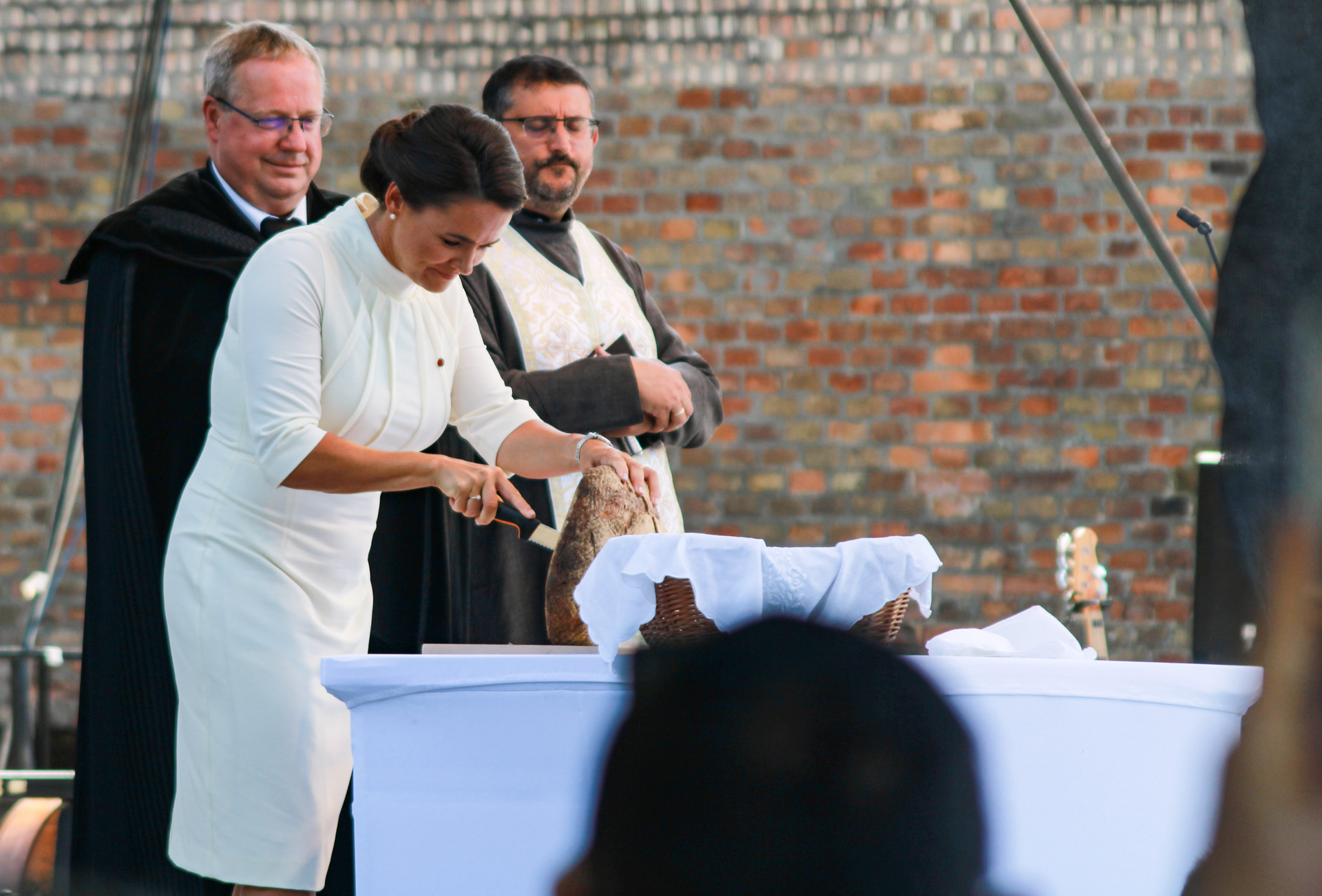 A beszéd után a római katolikus, görög katolikus, református és evangélikus lelkészek megszentelték az új kenyeret, majd Novák Katalin szelte fel.