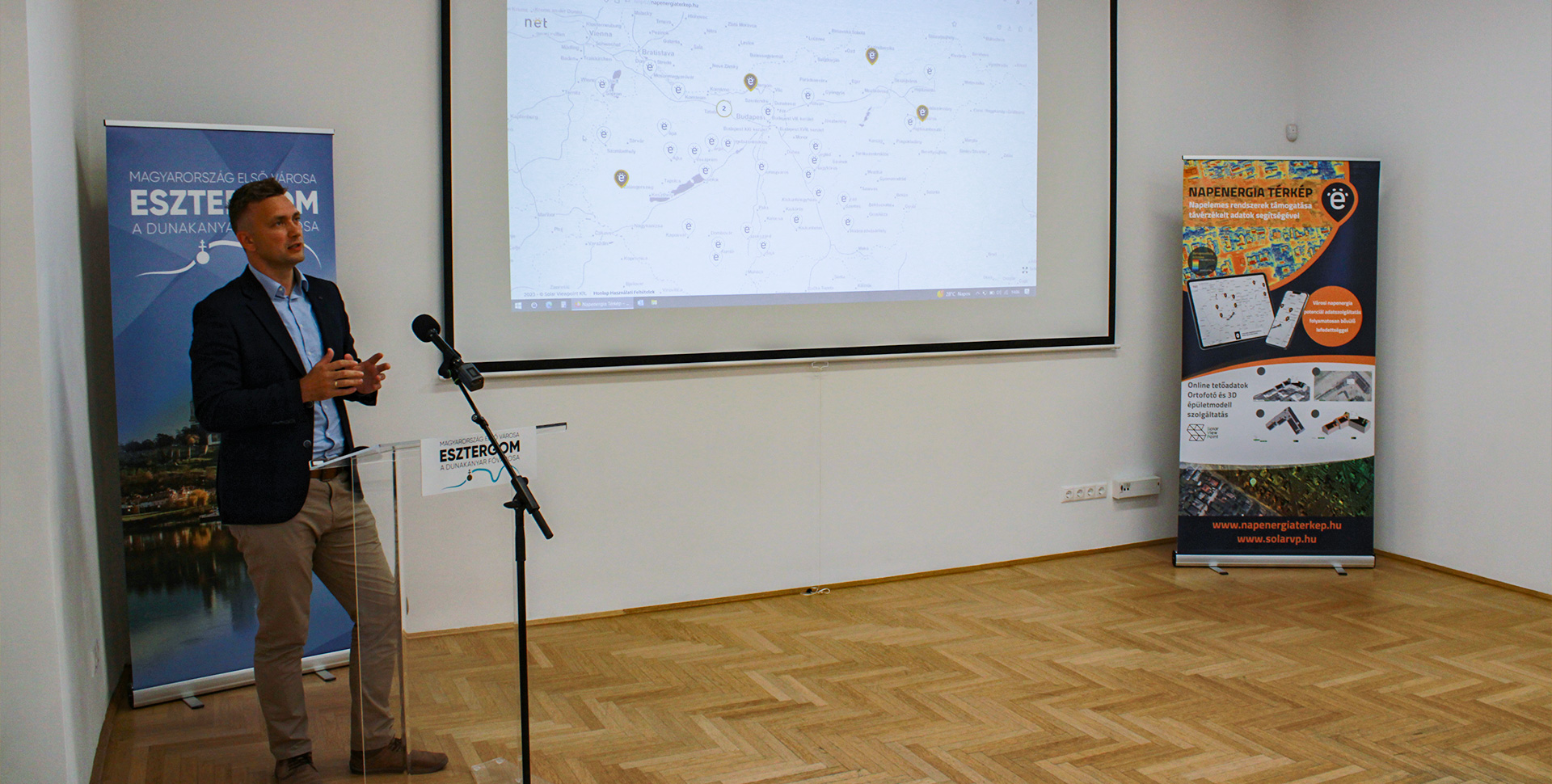 Berek Eleonóra beszédét követően Tran Balázs és Somogyi Csaba az Envirosement Hungary Kft. munkatársai ismertették a bárki számára ingyenesen elérhető szolgáltatást. Kiemelték, hogy Zalaegerszeg, Kazincbarcika, Debrecen és Miskolc után az országban ötödikként hozták létre Esztergom napenergia térképét. A térkép a napenergia potenciáljával kapcsolatosan ad információt egy-egy területről, településrészről és épületről az önkormányzatnak, a lakóknak, a cégeknek és a befektetőknek. Így az érdeklődők ingyenesen felmérhetik annak lehetőségét, hogy érdemes-e napelemes rendszert telepíteniük, illetve a kiválasztott lakóingatlan tetőfelületére kattintva megtekinthetik az épület besugárzási adottságait (hány kW/h áramot termelne egy évben a rendszer), illetve azt, hogy az adott tetőfelületen a telepítendő napelemes rendszerrel hozzávetőlegesen mekkora összeget tud megtakarítani a beruházó.