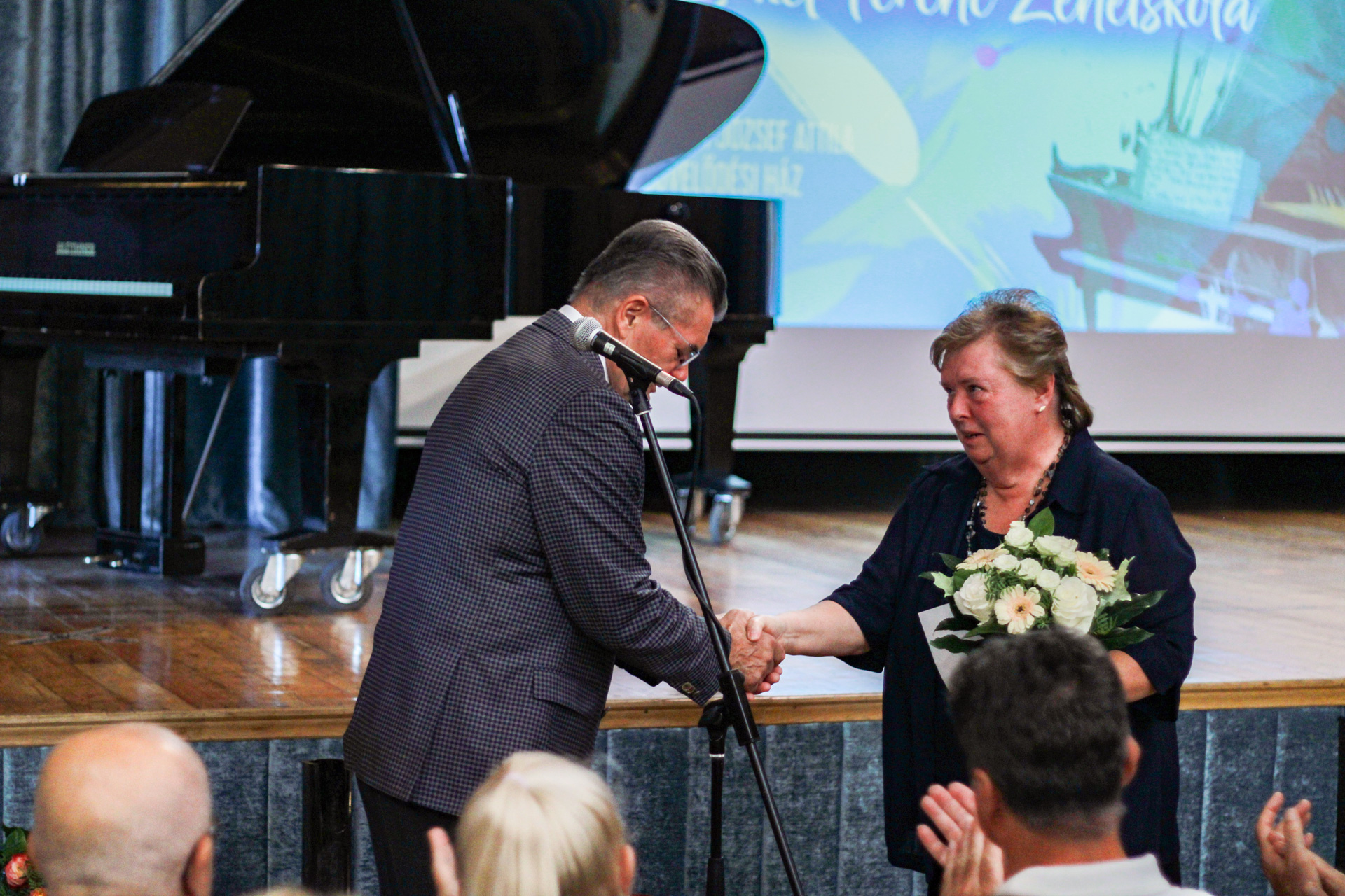 A felkonferálásban elhangzott, hogy 1953 augusztusában kezdődött meg Dorogon, állami keretek között a zeneoktatás. Zenekarcentrikus intézmény volt, elsősorban azokat a hangszereket oktatták, amelyekkel biztosíthatták az utánpótlást a szimfónikus és fúvós zenekar számára. 1972-ben költözött a Bécsi úti régi gyógyszertár épületébe az intézmény. Tanítványai és tanárai közül többen országos, sőt nemzetközi hírnévre tettek szert. 2023 őszén a zeneiskola méltó helyen, az Intézmények házában talált otthonra.