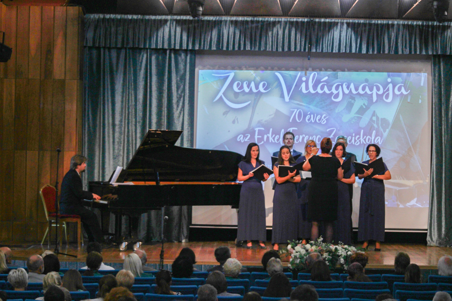 Az átadók után a zene világnapi rendezvényt a 70 éves zeneiskola Halleluja Kórusának csodálatos műsora zárta. Vezényelt Farkas Rose-Marie karnagy, zongorán közreműködött Kálvin Balázs. A Halleluja kamarakórus 2004-ben alakult a dorogi Erkel Ferenc Zeneiskola magánének szakos növendékeiből, melyhez később az iskola tanáraiból is csatlakoztak néhányan. Számos hangversenyt adtak Dorogon és vonzáskörzetében, valamint Budapesten, de több fellépésük volt már külföldön is. Rendszeresen részt vesznek a városi ünnepségeken és a nagy egyházi ünnepeken. Szeptember közepén a Gáthy Zoltán Városi Könyvár 70 éves évfordulójának záró rendezvényén léptek fel nagy sikerrel. Sok éven át rendszeres résztvevői voltak a Piliscsabai Egyházzenei Napoknak és az Énekel az ország című rendezvénynek, melynek keretében Hollerung Gábor karmester vezényletével minden évben egy teljes oratóriumot mutat be a Művészetek Palotájában az ország különböző részeiből érkezett egyesített kórus. 2011-ben koncertkörúton vettek részt Erdélyben, a Kolozsvári Barnabásné által alapított és vezetett Pachelbel kamarazenekarral együtt. 2013-ban bemutatták Kálvin Balázs Cselenyák Imre szövegkönyve alapján írt meseoperáját, A szorgalmas és a rest lányt a Pachelbel kamarazenekar kíséretével, melyet a környék ifjúsága Dorogon, Leányváron és Tokodon láthatott. A művel 2014-ben a nagyváradi, nagyszalontai és dévai gyermekotthonok közönségét is megörvendeztették. Kálvin Balázs az Erkel Ferenc zeneiskolában kezdte el zongora tanulmányait Gerstner Bálintné tanítványaként, akit elhivatott munkájáért Miniszteri Dicséretben, valamint a Dorogiak Dorogért és a Bonis Bona díjban részesítettek. Tanárnője biztatására gyermekkora óta foglalkozik zongorakísérettel, kamarazenével. A Zeneakadémia elvégzése óta a Magyar Állami Operaház zongorakísérője. Kapcsolata a Halleluja kamarakórussal fennállása óta töretlen. 2016-ban Dorog Város Önkormányzatának támogatásával az angliai Southend-on-See-ben az 1956-os forradalom 60 éves évfordulója alkalmából a kamarakórus és a Pachelbel kamarazenekar ünnepi hangversenyt adtak. Az eseményen részt vett Magyarország konzuljaj, és többen az ott élő 56-os menekültek közül. Az együttes gazdag repertoárja a többségben lévő egyházzenei művektől az operán, operetten keresztül a musicalig terjed. Mottójuk, mely munkásságukat jellemzi: „Örömöt szerezni örömmel, tiszta szívből.”
