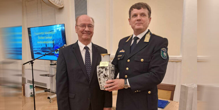 Farkas Gábor rendőr dandártábornoknak kimagasló szakmai munkája, valamint a kamara tevékenységét segítő együttműködés elismeréseként távozása alkalmából egy emléktárgyat adományozott a Komárom-Esztergom Vármegyei Kereskedelmi és Iparkamara. A díszes vázát Dr. Szerencsés László, a kamara elnöke adta át.