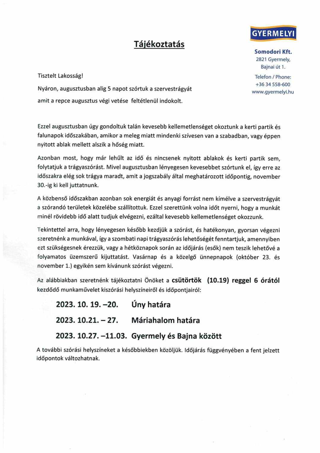 A Gyermelyi Vállalatcsoport (Gyermelyi Zrt.) Növénytermesztési Ágazata (Somodori Növénytermesztő Kft.) tájékoztatja a lakosságot, hogy 2023. október 19-20. között Úny határában, október 21-27. között Máriahalom határában, míg október 27-november 3. között Gyermely és Bajna között szervestrágya-szórást végeznek.